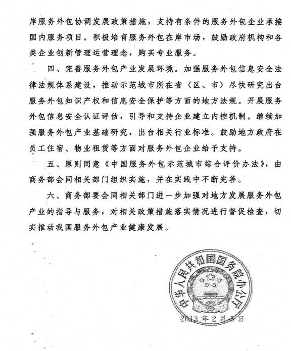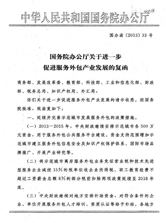 国务院办公厅 关于进一步促进服务外包产业发展的复函