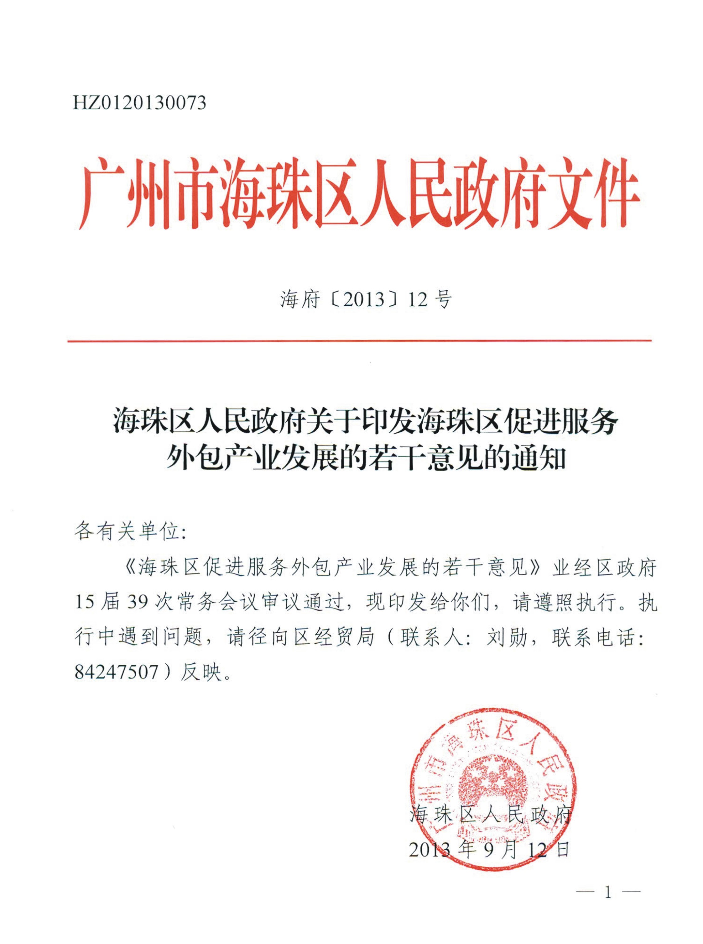 海珠区人民政府关于印发海珠区促进服务外包产业发展的若干意见的通知