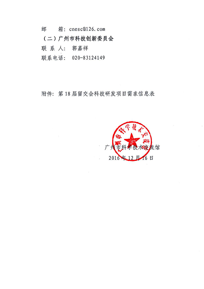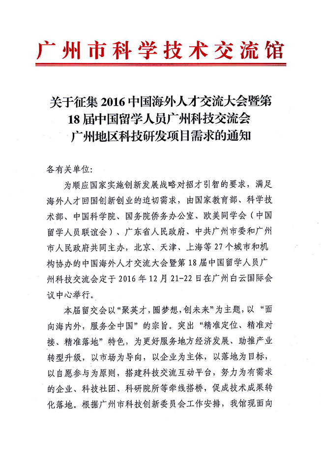 关于征集2016中国海外人才交流大会暨第18届中国留学人员广州科技交流会广州地区科技研发项目需求的通知