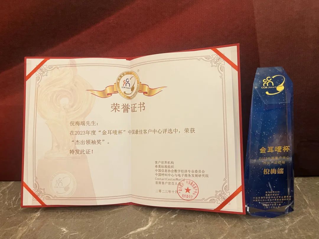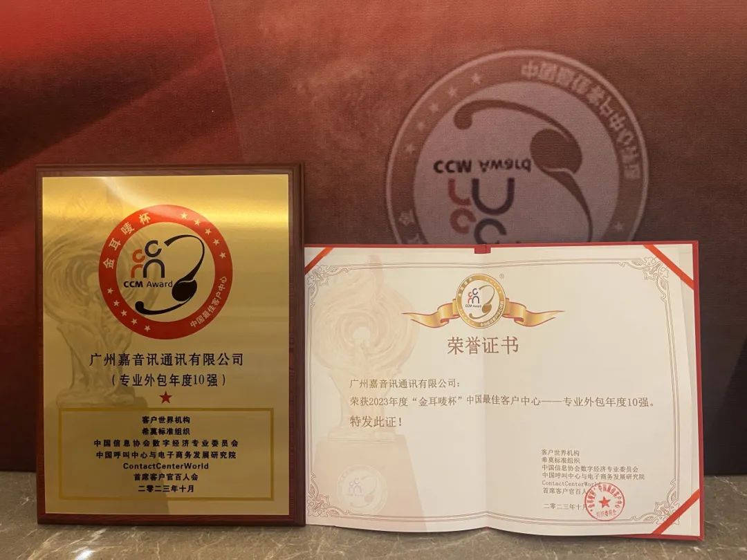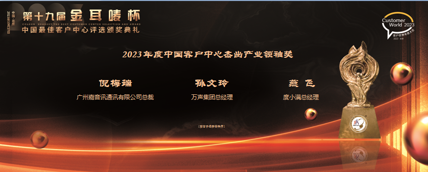 广州嘉音讯通讯有限公司荣获2023年“金耳唛杯”中国最佳客户中心“专业外包年度10强”奖,倪总荣获“杰出产业领袖”奖。